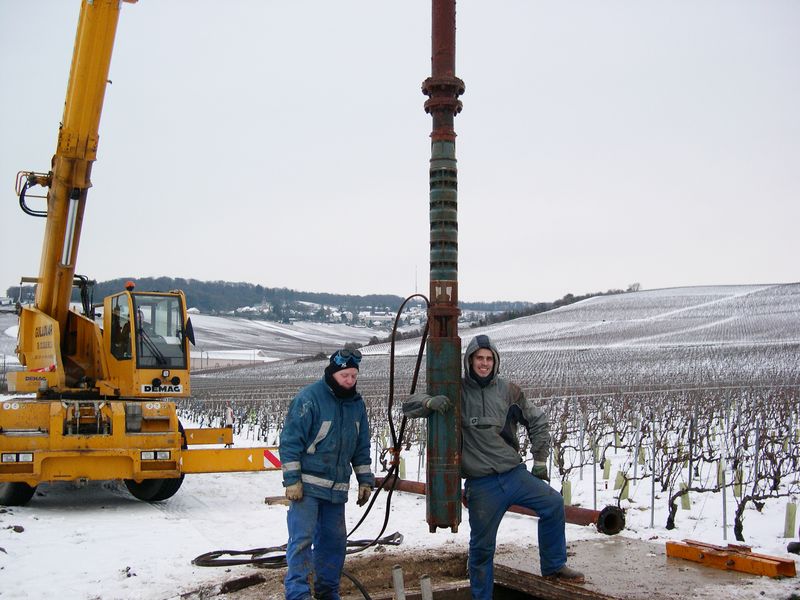 La pompe de forage est reliée à un système de canalisations munies de buses de pulvérisation, réparties dans les routes de vigne.